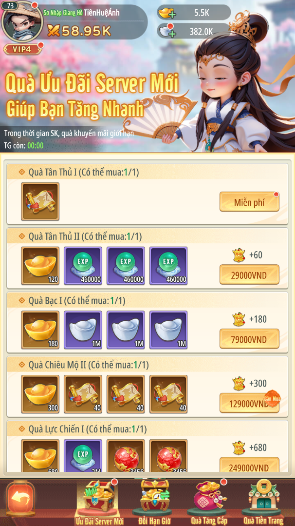 - Các gói quà có giá ưu đãi, chỉ mở trong 7 ngày đầu mở server.