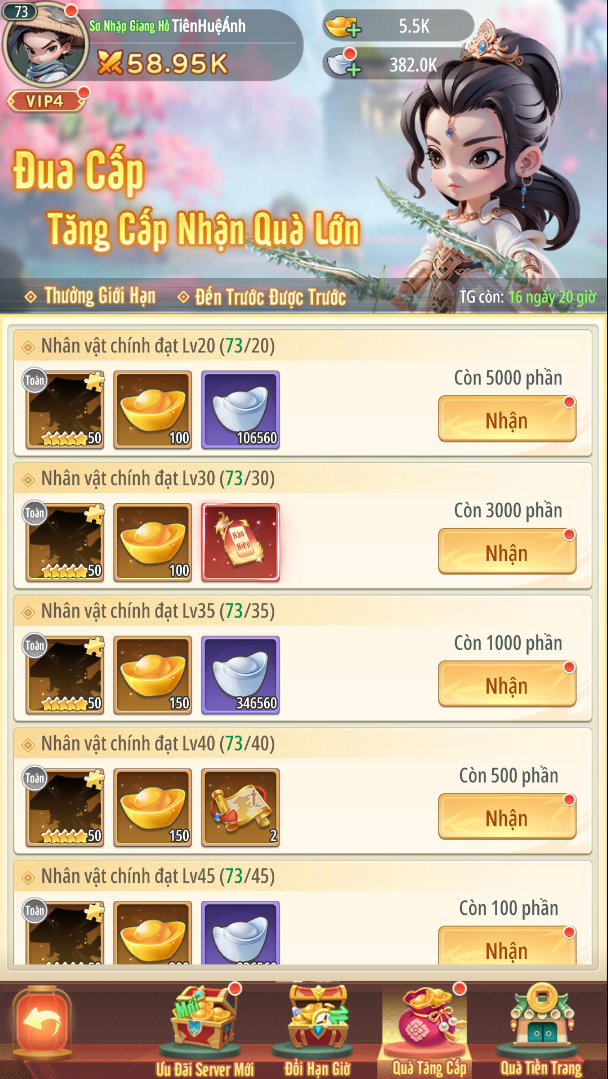 - Lên cấp nhận Mảnh Hiệp Khách 5 Sao, KNB và các vật phẩm khác.