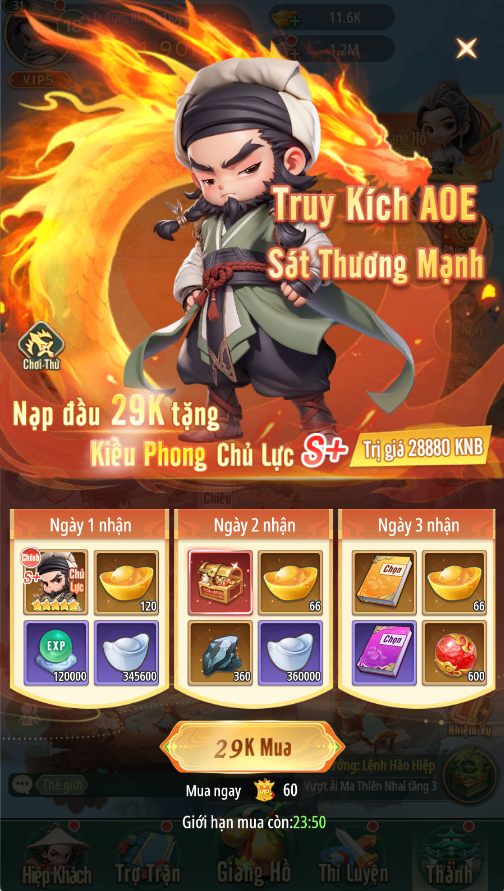 - Chỉ cần mua gói nạp đầu, các Đại Hiệp sẽ nhận ngay Kiều Phong Chủ Lực S+ (Truy Kích AOE, Sát Thương Mạnh) giá trị lên tới 28880 KNB và các vật phẩm khác, nhận 3 ngày liên tục.